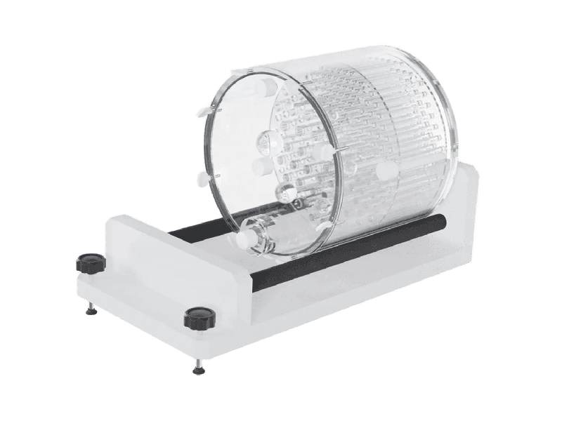 Automatic table mixer for mixing radioactive solutions in nuclear medicine cylindrical volume phantoms (e.g., PET, SPECT). Automatic mixing makes the radio-nuclide solution more homogeneous, reduces time spent on test preparation, and reduces radiation exposure for personnel. Using special double rollers to rotate the cylinder prevents damage to the surface of the phantom.