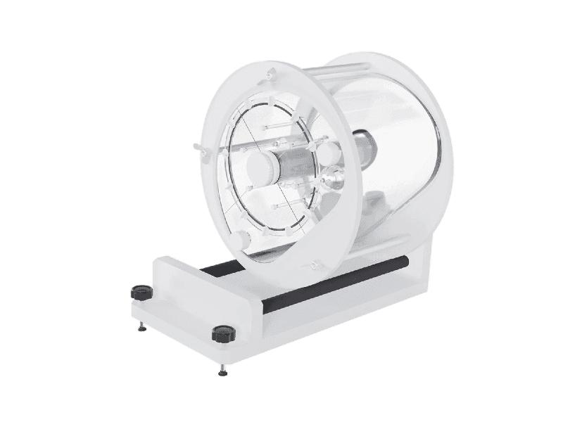 Automatic table mixer for mixing radioactive solutions in nuclear medicine cylindrical volume phantoms (e.g., PET, SPECT). Automatic mixing makes the radio-nuclide solution more homogeneous, reduces time spent on test preparation, and reduces radiation exposure for personnel. Using special double rollers to rotate the cylinder prevents damage to the surface of the phantom.
