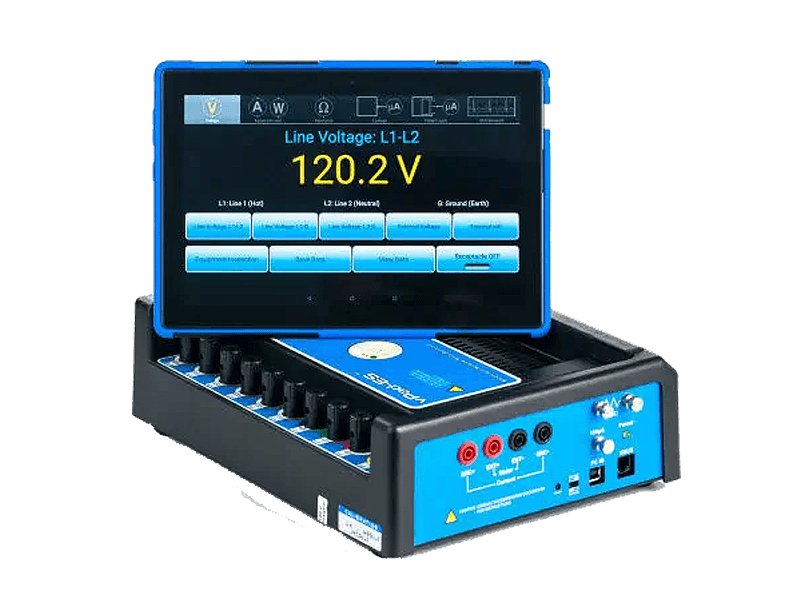 The vPad-ES2 series of electrical safety testing devices combines an Android tablet (wired or wireless) with a measurement platform to create a revolutionary test system. The measurement platform provides the normal assortment of electrical measurements (voltage, current and resistance) of the commonly used medical Electrical Safety Standards.